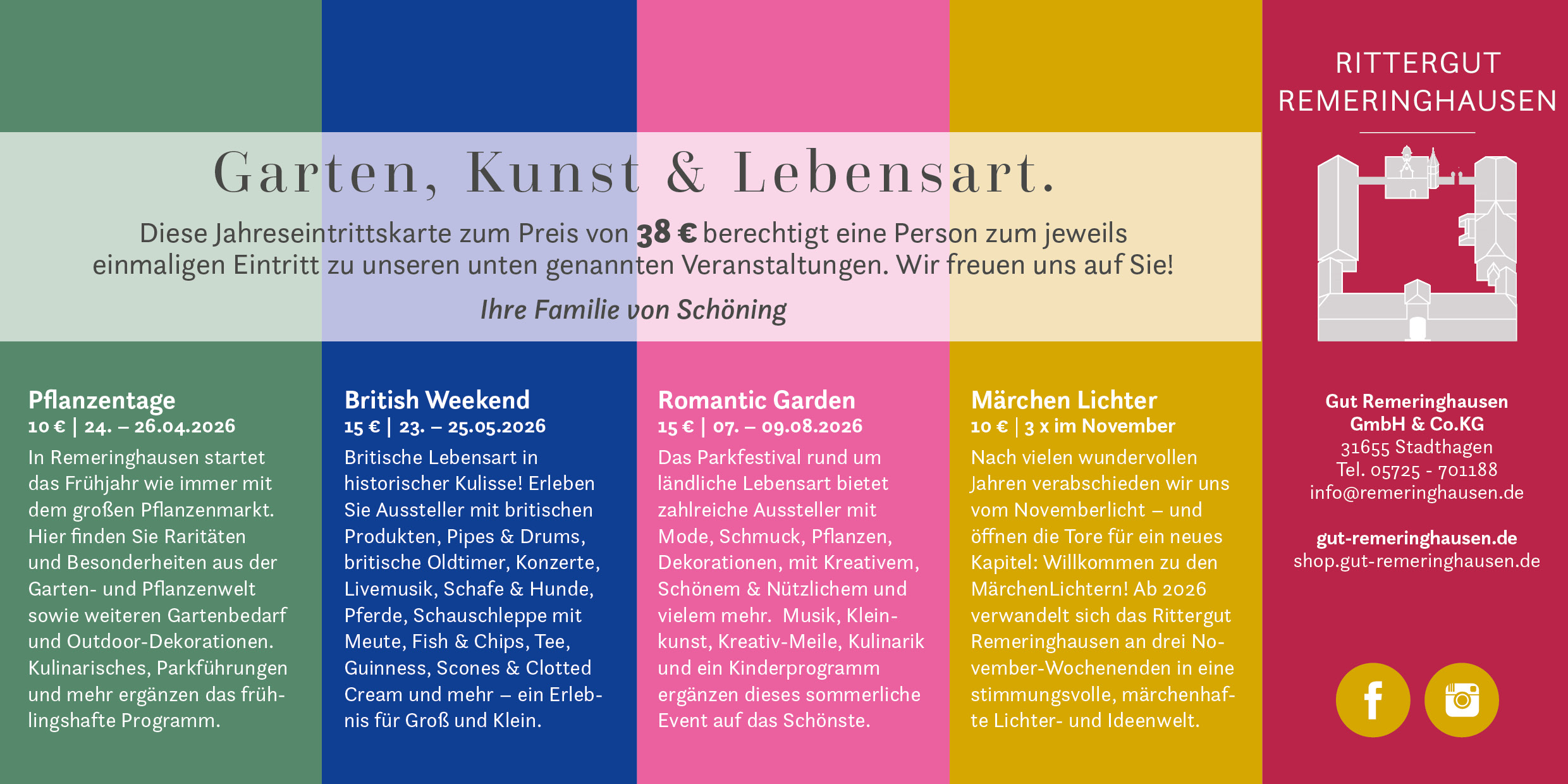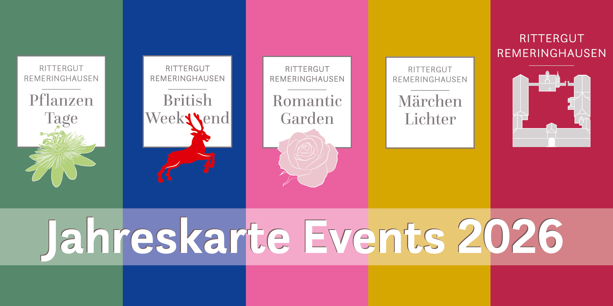 Die Jahreskarte berechtigt eine Person jeweils einmalig zum Eintritt zu allen vier großen Veranstaltungen auf Rittergut Remeringhausen. Und das zum Vorteilspreis: